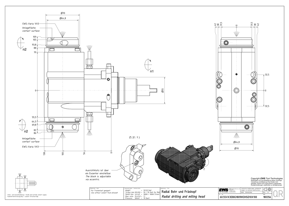 60.55VX3DBIG1809IKDHSD10X100 — Radial drilling and milling head, EWS — Varia VX3 — Adaptor, double spindle, Similar to DIN 1809 drive, IC/EC Ceramic pmax = 70bar, Highspeed till 10000 1/min, X = 100mm,