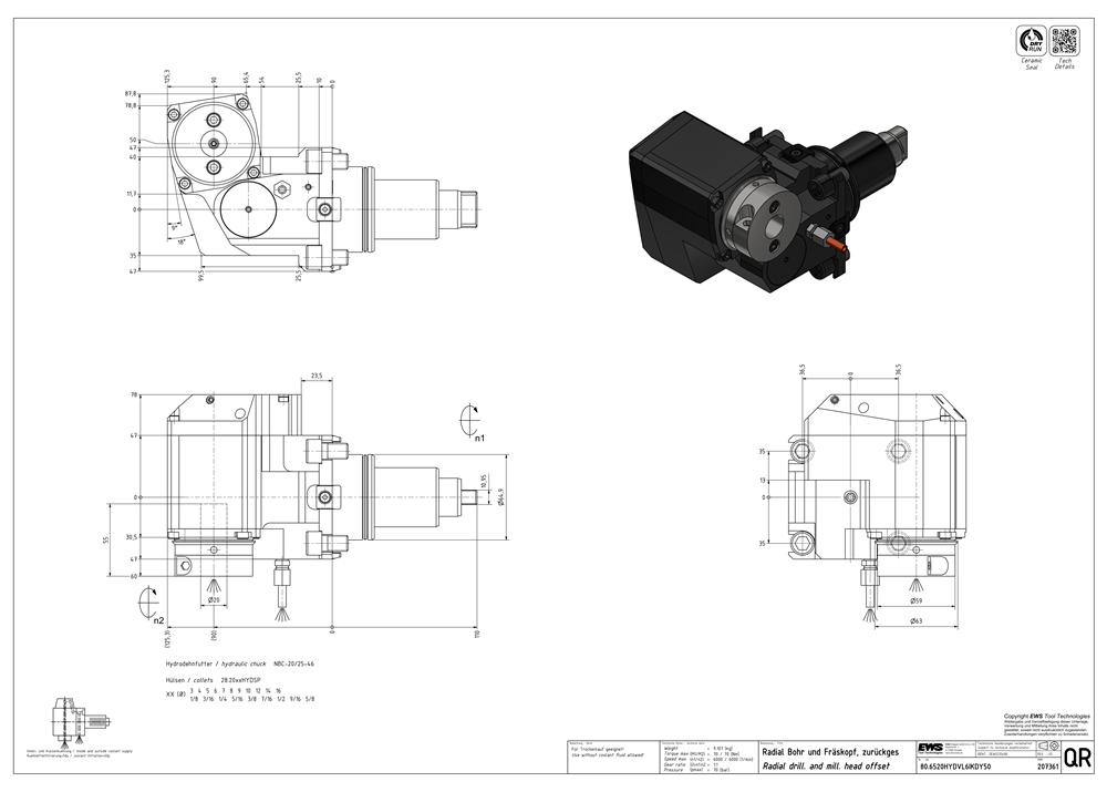 80.6520HYDVL6IKDY50 — Radial drill. and mill. head offset, Hydraulic chuck Ø 20, Similar to DIN 1809 drive, IC/EC Ceramic pmax = 70bar, i =1:1 direction of rotation inver., Y = 50mm,