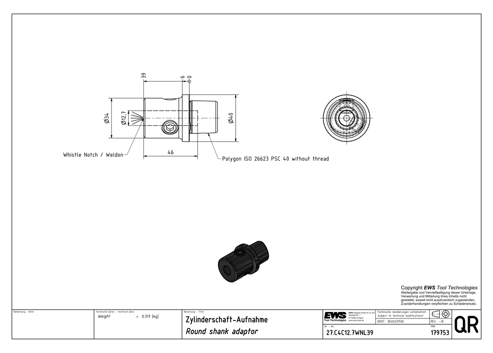 U-drill holder Weldon/Whistle Notch Dia. 12.7 (0.5 inch) Weight: 0.317