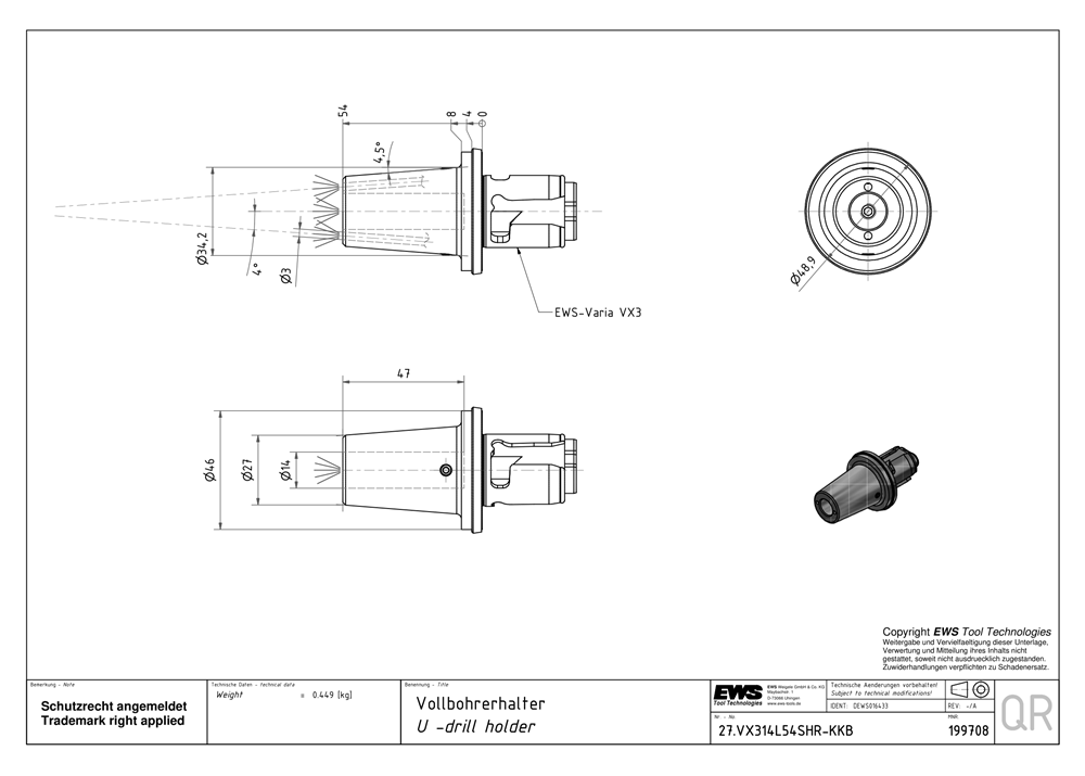 U-drill holder Dia. 14 EWS Varia insert VX3 Weight: 0.449