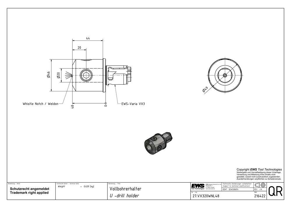 27.VX320WNL48 — Adapter EWS — Varia VX3 — Adaptor, Round shank adaptor, Whistle Notch/Weldon Ø 20, Length = 48mm,