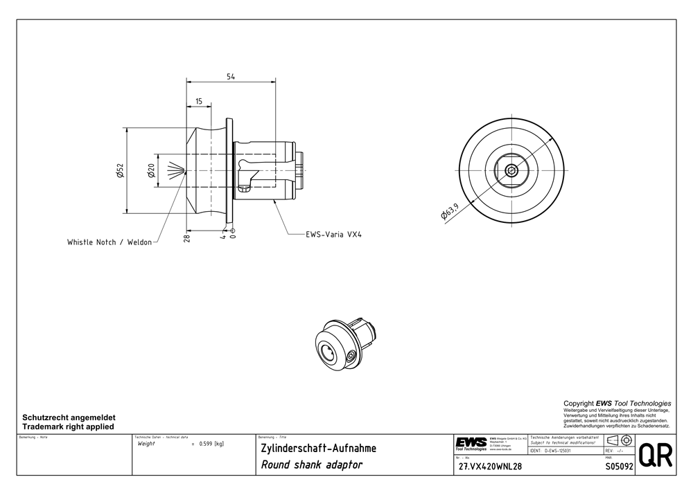 27.VX420WNL28 — Adapter EWS — Varia VX4 — Adaptor, Round shank adaptor, Whistle Notch/Weldon Ø 20, Length = 28mm,