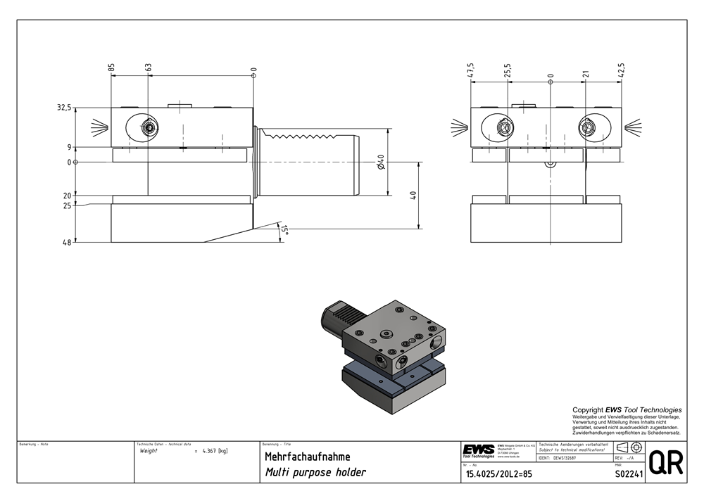 15.4025/20L2=85 — Multi purpose holder, Square 25/20, DIN 69 880 Form D1, for three tools