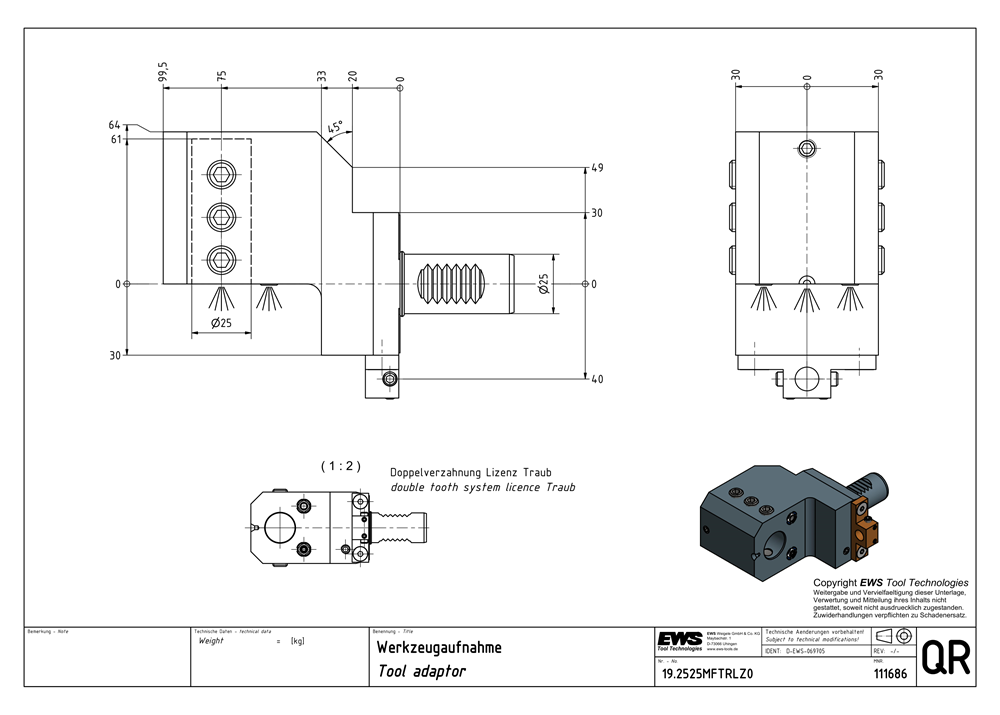 19.2525MFTRLZ0 — Tool adaptor, hole -Ø 25 mm, Double serration, Z=0 mm, Cover not convertible