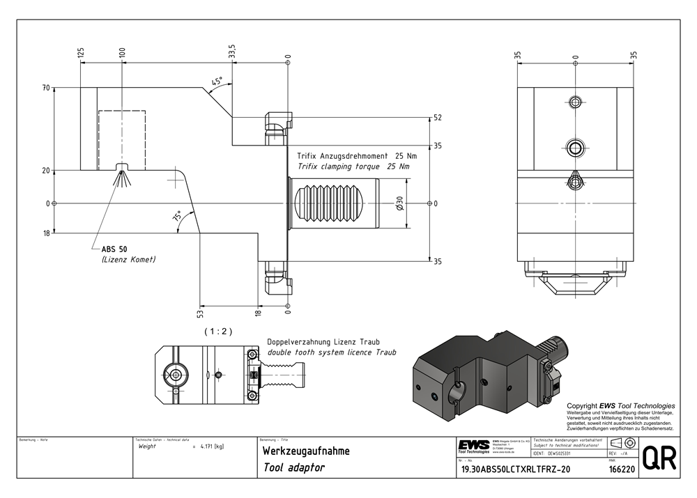 19.30ABS50LCTXRLTFRZ-20 — Tool adaptor, ABS 50 ( Licence Komet ), long version, Double serration, Trifix-alignment right,