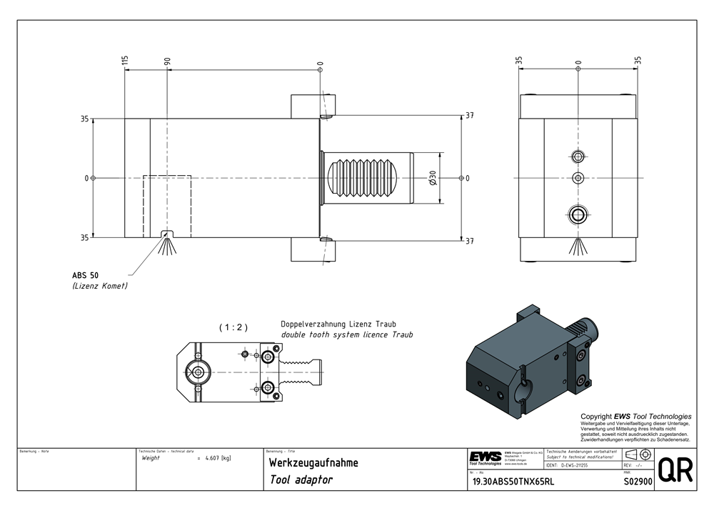 19.30ABS50TNX65RL — Tool adaptor, ABS 50 ( Licence Komet ), Double serration,
