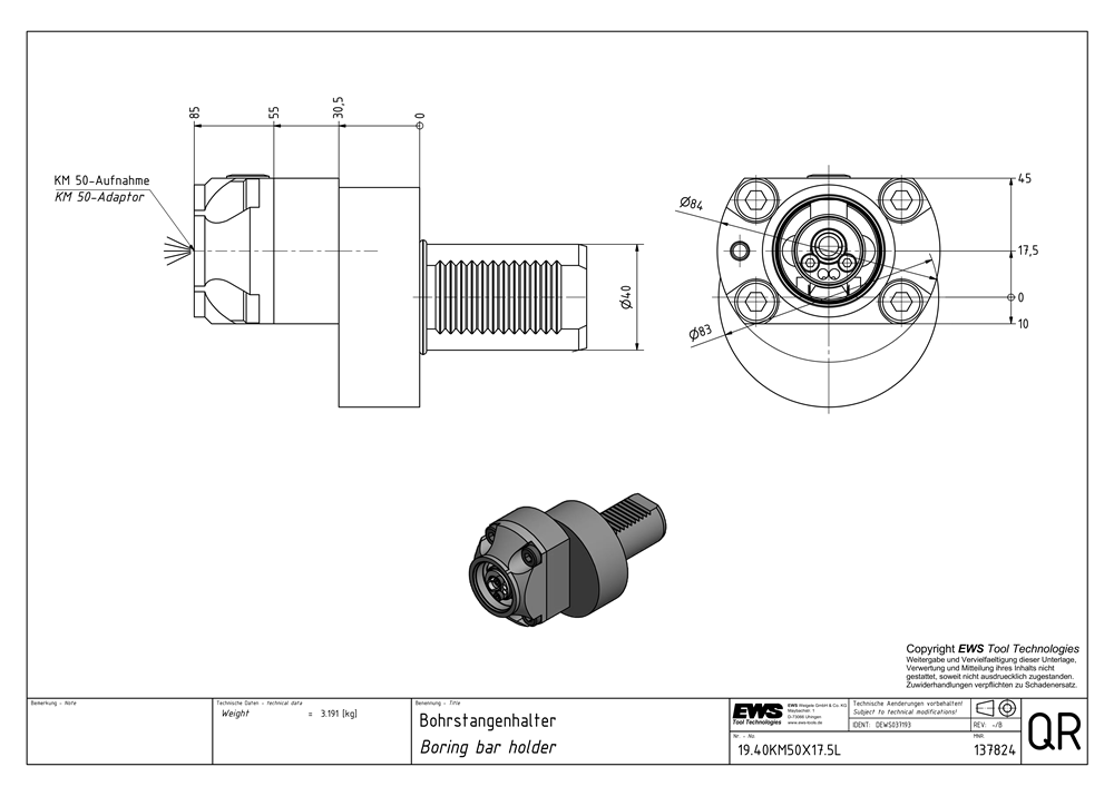 Boring bar holder KM 50 System (License Kennametal) Weight: 0.000