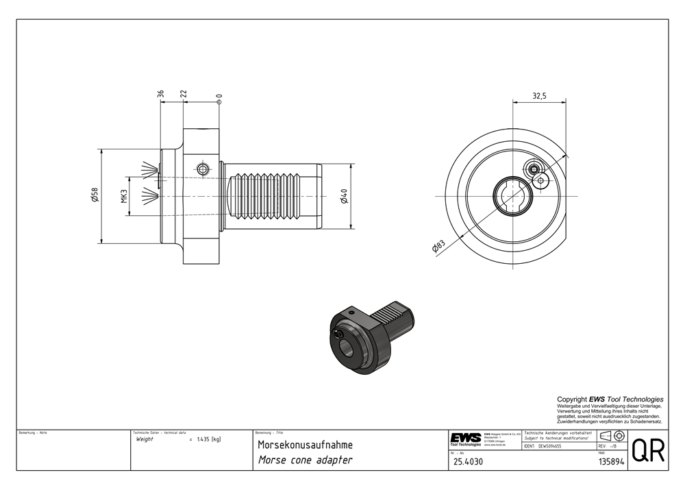 25.4030 — Morse cone adapter, Shank- Ø40, Morse cone MK3
