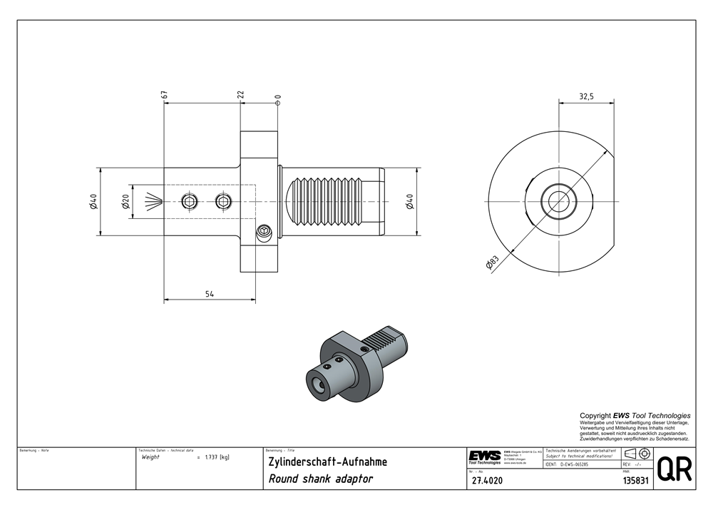 27.4020 — Round shank adaptor, Shank- Ø40, hole -Ø20 mm