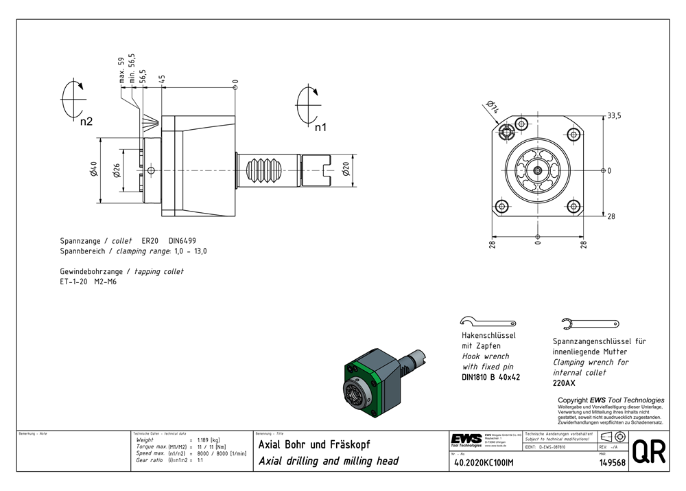 40.2020KC100IM — Axial drilling and milling head, For collet 200 428E (ER20 Ø2-13), short, External coolant supply, i = 1:1 (input equal output), inside collet nut,