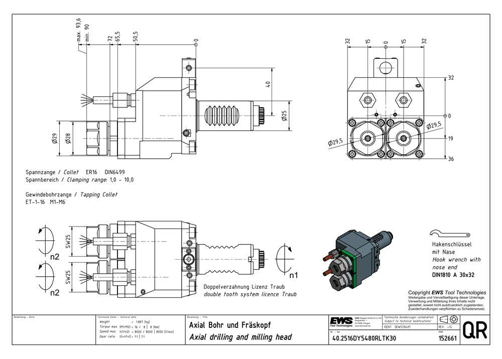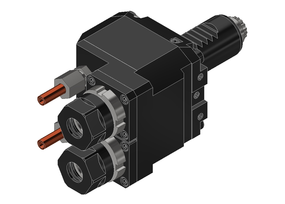 40.2516DY5480RLTK30 — Axial drilling and milling head, For collet 160 426E (ER16 Ø1-10), double spindle in Y-axis, External coolant supply, i =1:1 direction of rotation inver., pitch circle 30mm,