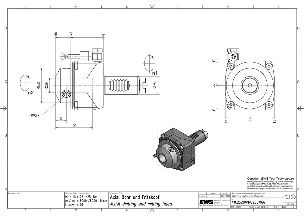40.2520WNG200X66 — Axial drilling and milling head, Whistle Notch/Weldon Ø20, External coolant supply, i = 1:1 (input equal output),