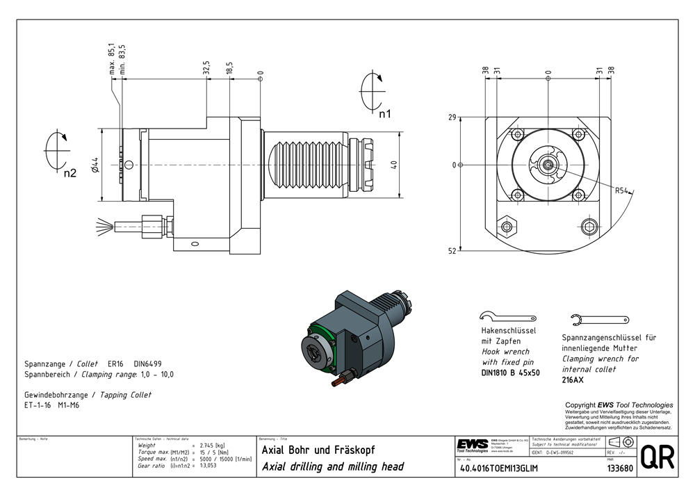 40.4016TOEMI13GLIM — Axial drilling and milling head, For collet 160 426E (ER16 Ø1-10), External coolant supply, i = 1:3 (input equal output), inside collet nut,
