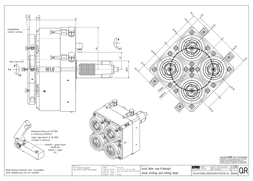 40.40VX3QVL3IKDTK100/TK101.8-S4 — Axial drilling and milling head, EWS — Varia VX3 — Adaptor, quatro spindle, IC/EC Ceramic pmax = 70bar, i =1:1 direction of rotation inver., pitch circle 100mm/101.8mm,