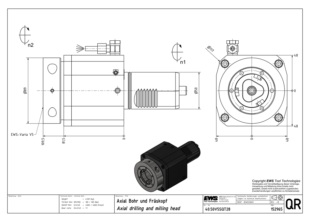 40.50V5SQT28 — Axial drilling and milling head, EWS — Varia V5- Adaptor, External coolant supply, i = 1:1 (input equal output),