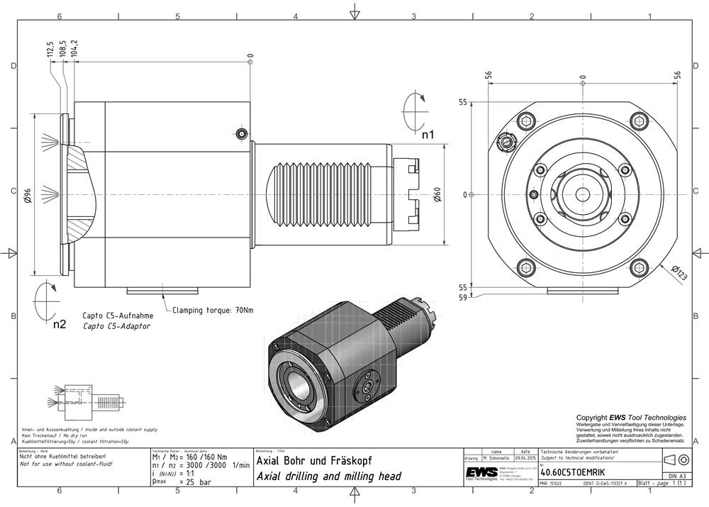 40.60C5TOEMRIK — Axial drilling and milling head, Polygon ISO 26623 PSC 50, Int. / ext. coolant pmax = 25bar, i = 1:1 (input equal output),