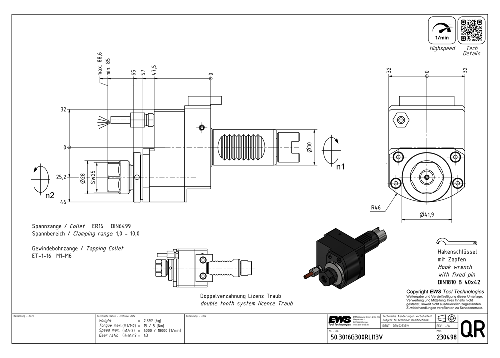 50.3016G300RLI13V — Ax. drill. and mill. head offset, For collet 160 426E (ER16 Ø1-10), single groove coupling drive, External coolant supply, i =1:3 direction of rotation inver., V — Plate( Licence INDEX ),