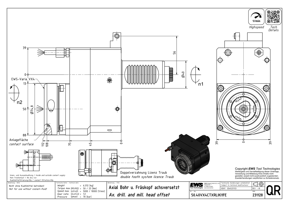 50.40VX4CTXRLIKI1FE — Ax. drill. and mill. head offset, EWS — Varia VX4 — Adaptor, DIN 5480 drive, Int. / ext. coolant pmax = 70bar, i =1:2 direction of rotation inver., Excenter plate EWS-adjust,