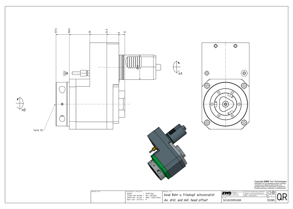 50.50V5MP630R — Ax. drill. and mill. head offset, EWS — Varia V5- Adaptor, Similar to DIN 1809 drive, External coolant supply, i =1:1 direction of rotation inver.,