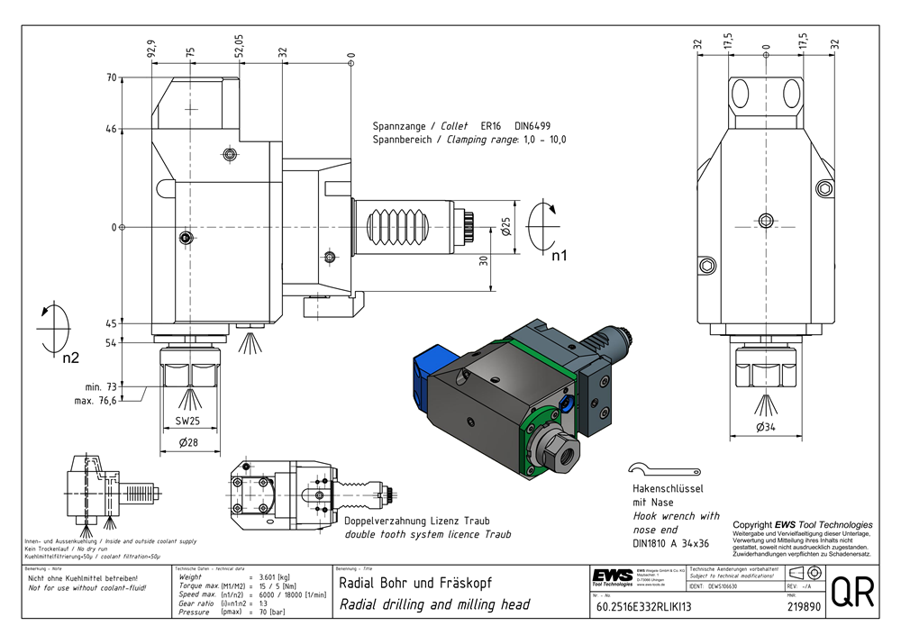60.2516E332RLIKI13 — Radial drilling and milling head, For collet 160 426E (ER16 Ø1-10), Coupling DIN 5480 ( Patent Sauter ), Int. / ext. coolant pmax = 70bar, i =1:3 direction of rotation inver.,