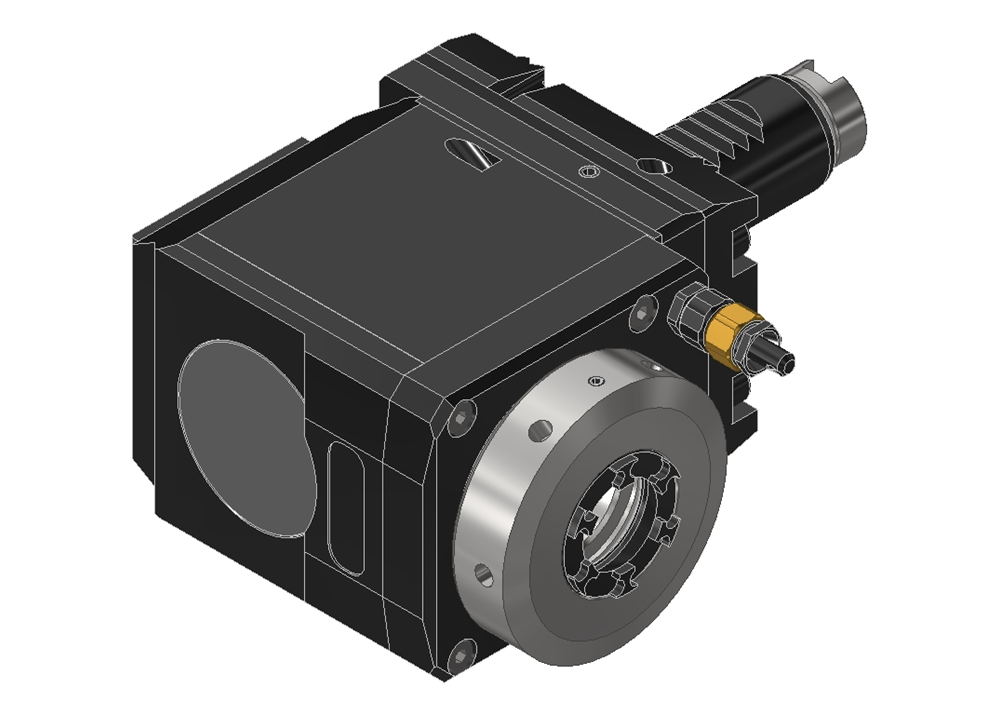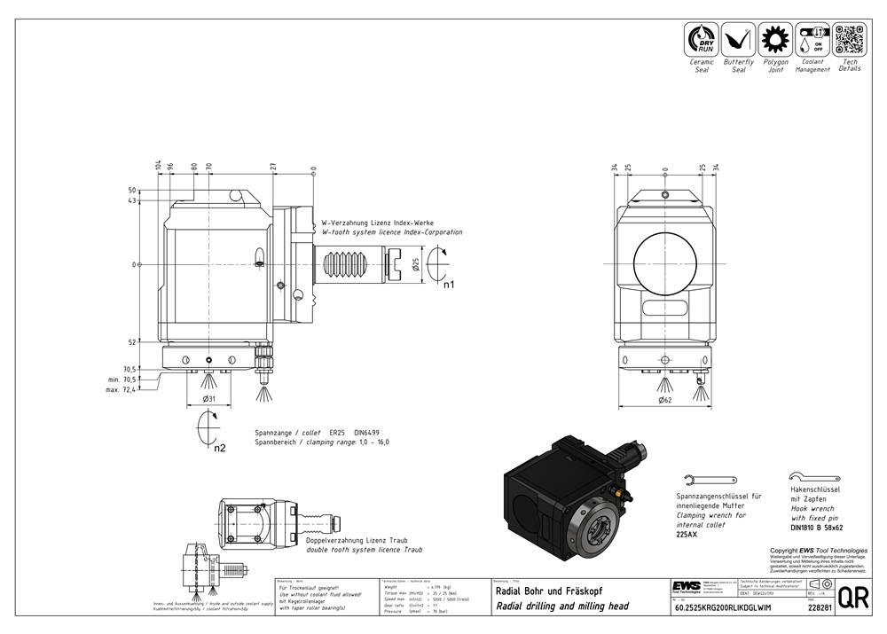 60.2525KRG200RLIKDGLWIM — Radial drilling and milling head, For collet 250 430E (ER25 Ø2-16), with tapered roller bearing, single groove coupling drive, IC/EC Ceramic pmax = 70bar, i = 1:1 (input equal output), W — seration (License INDEX ), inside collet nut, Butterfly-Seal, cool.manag., polyg.