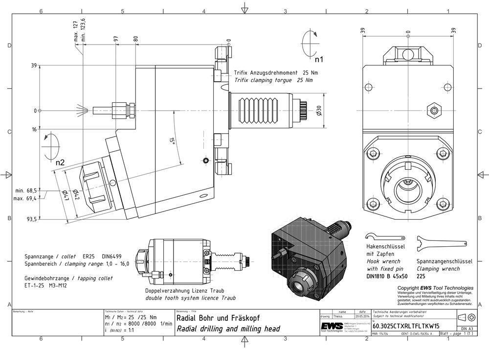 60.3025CTXRLTFLTKW15 — Radial drilling and milling head, For collet 250 430E (ER25 Ø2-16), DIN 5480 drive, External coolant supply, i =1:1 direction of rotation inver., Trifix-alignment left, fixed angle of 15°,