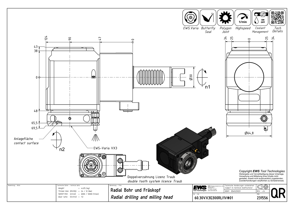 60.30VX3G300RLI1V#01 — Radial drilling and milling head, EWS — Varia VX3 — Adaptor, single groove coupling drive, External coolant supply, i =1:2 direction of rotation inver., V — Plate( Licence INDEX ), Butterfly-Seal, cool.manag., polyg.