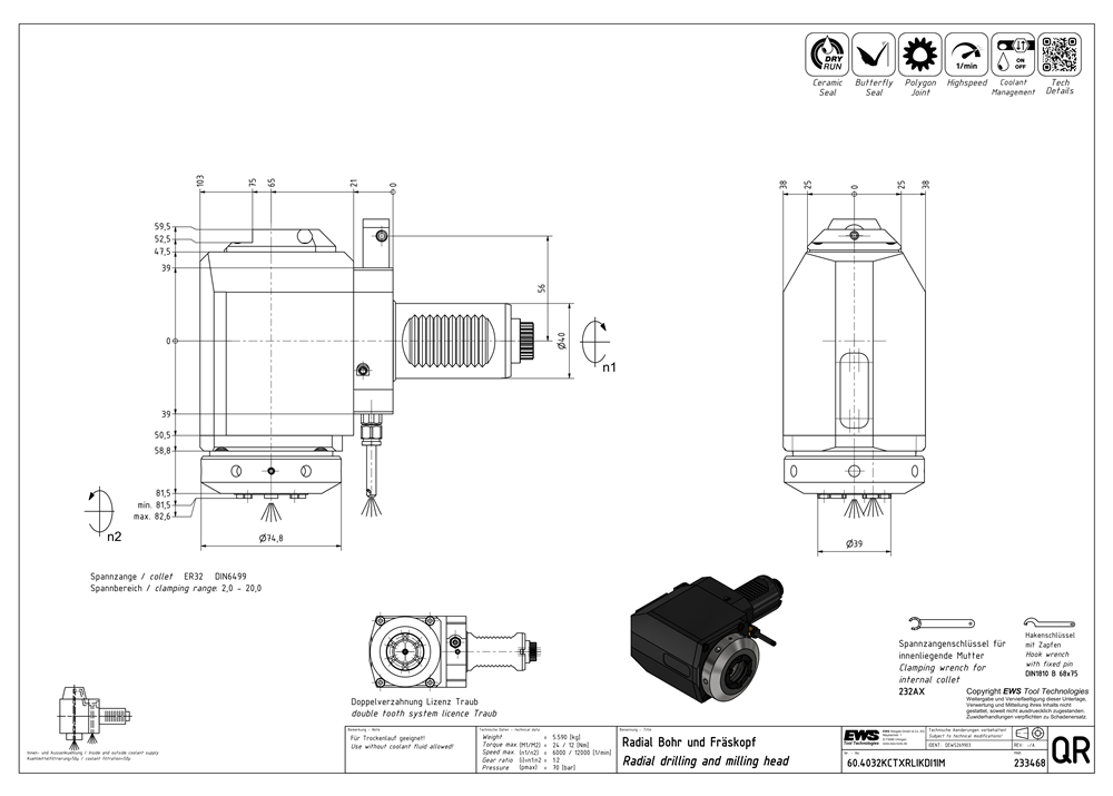 60.4032KCTXRLIKDI1IM — Radial drilling and milling head, For collet 320 470E (ER32 Ø3-20), short, DIN 5480 drive, IC/EC Ceramic pmax = 70bar, i =1:2 direction of rotation inver., inside collet nut, Butterfly-Seal, cool.manag., polyg.