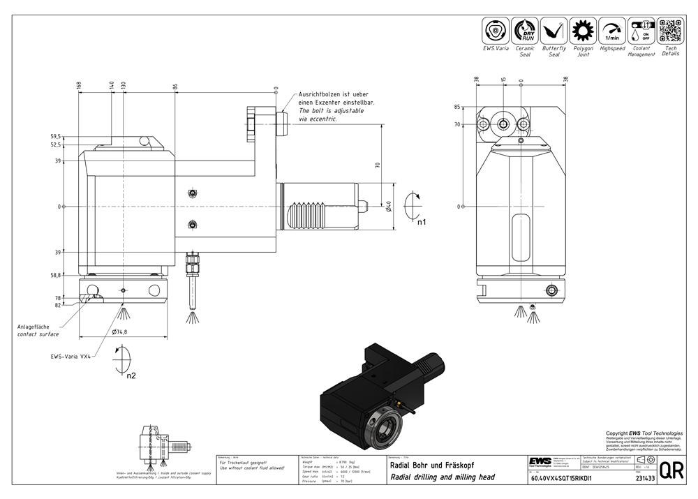 60.40VX4SQT15RIKDI1 — Radial drilling and milling head, EWS — Varia VX4 — Adaptor, Similar to DIN 1809 drive, IC/EC Ceramic pmax = 70bar, i =1:2 direction of rotation inver., Butterfly-Seal, cool.manag., polyg.