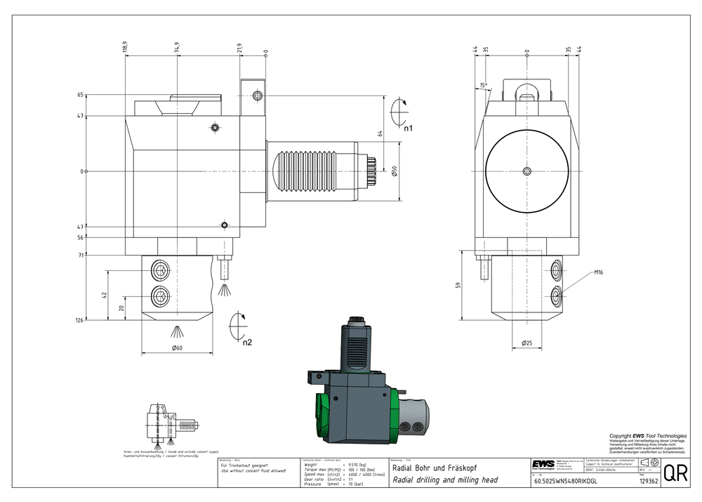 60.5025WN5480RIKDGL — Radial drilling and milling head, Whistle Notch/Weldon Ø25, DIN 5480 drive, IC/EC Ceramic pmax = 70bar, i = 1:1 (input equal output),
