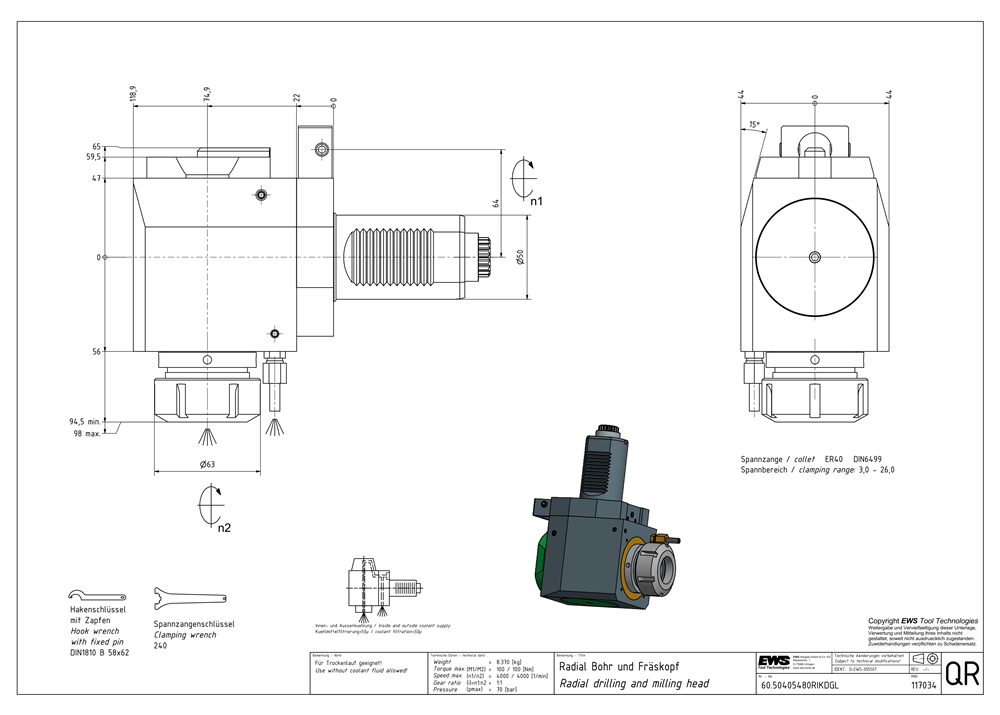 60.50405480RIKDGL — Radial drilling and milling head, For collet 400 472E (ER40 Ø4-26), DIN 5480 drive, IC/EC Ceramic pmax = 70bar, i = 1:1 (input equal output),