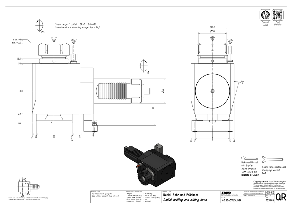 60.5040VL5LIKD — Radial drilling and milling head, For collet 400 472E (ER40 Ø4-26), Similar to DIN 1809 drive, IC/EC Ceramic pmax = 70bar, i =1:1 direction of rotation inver.,