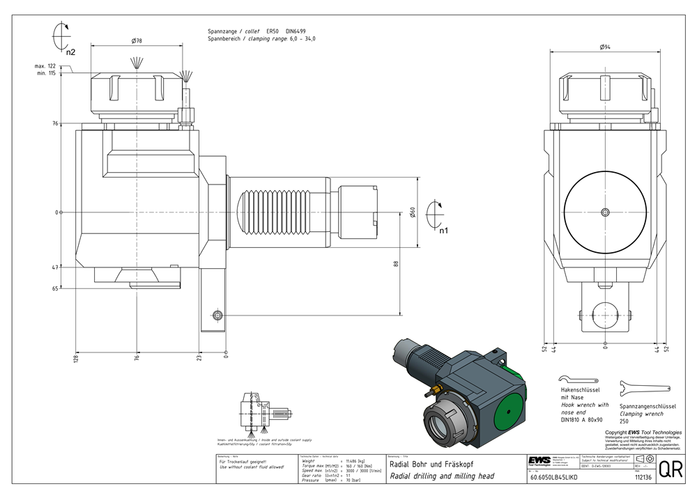 60.6050LB45LIKD — Radial drilling and milling head, For collet 500 477E (ER50 Ø12-34), claw coupling drive, IC/EC Ceramic pmax = 70bar,