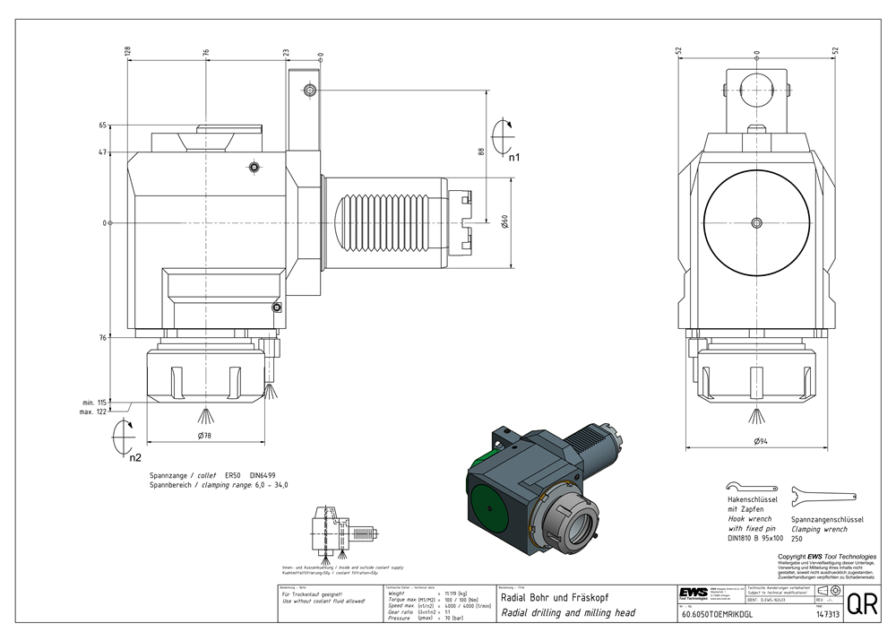 60.6050TOEMRIKDGL — Radial drilling and milling head, For collet 500 477E (ER50 Ø12-34), crown coupling drive, IC/EC Ceramic pmax = 70bar, i = 1:1 (input equal output),