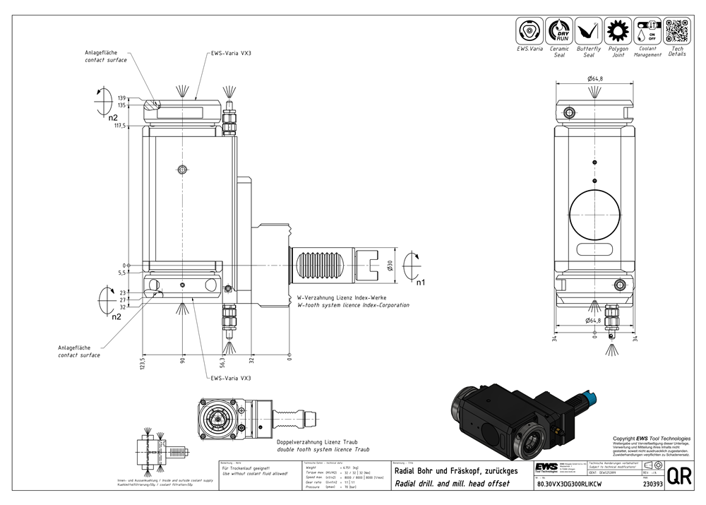 80.30VX3DG300RLIKCW — Radial drill. and mill. head offset, EWS — Varia VX3 — Adaptor, double spindle, single groove coupling drive, IC/EC Ceramic pmax = 70bar, i =1:1, W — seration (License INDEX ), Butterfly-Seal, cool.manag., polyg.