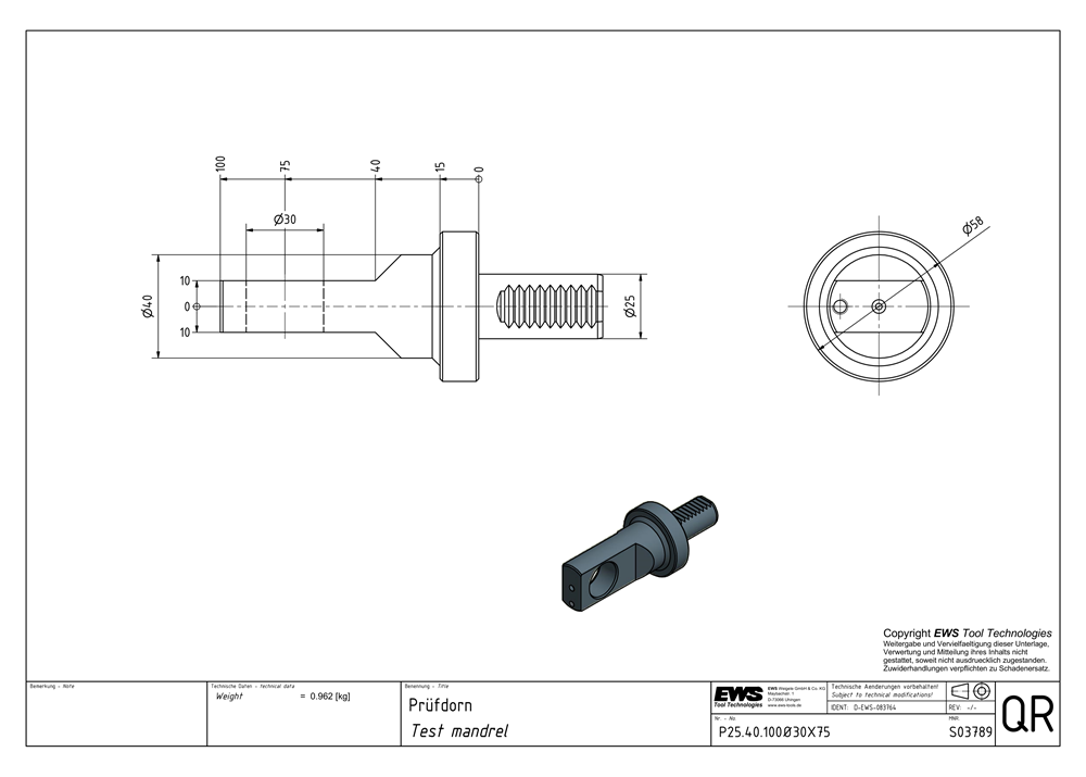 P25.40.100Ø30X75 — Test mandrel, Shank- Ø25, OD Ø 40